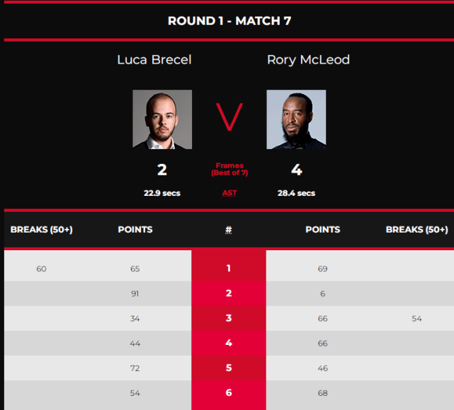 第二局,布雷切尔通过几次上手,91-6扳回一局,比分追成1-1。第三局,麦克劳德再度占据优势,他打出单杆54分,66-34再胜一局,2-1再次领先。